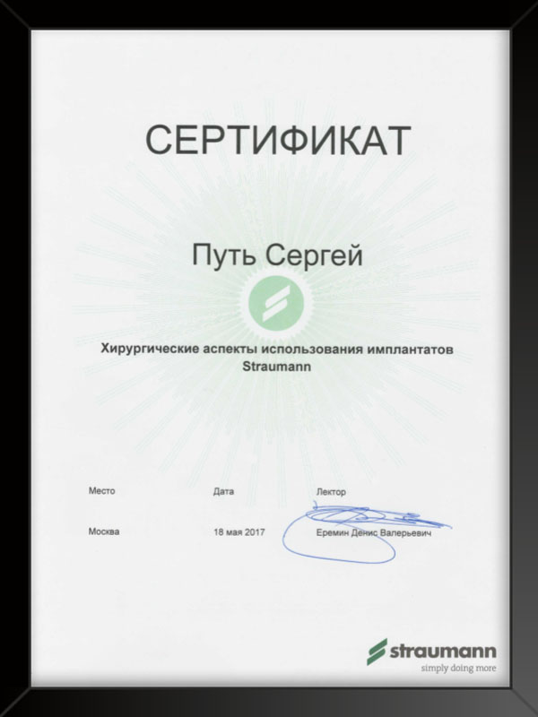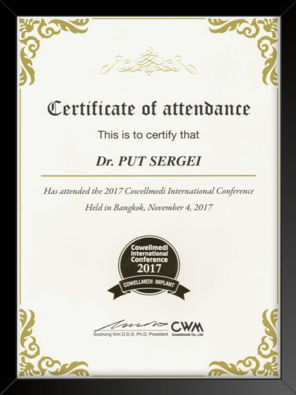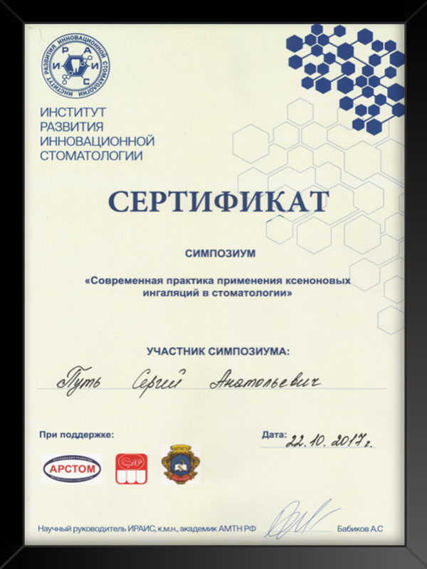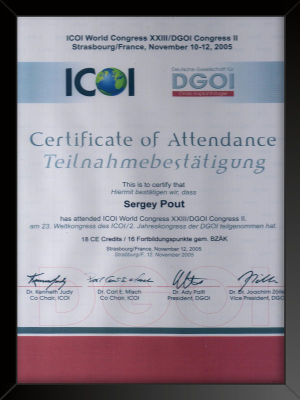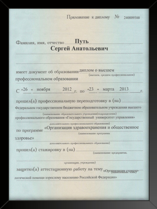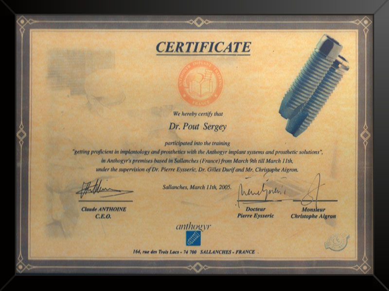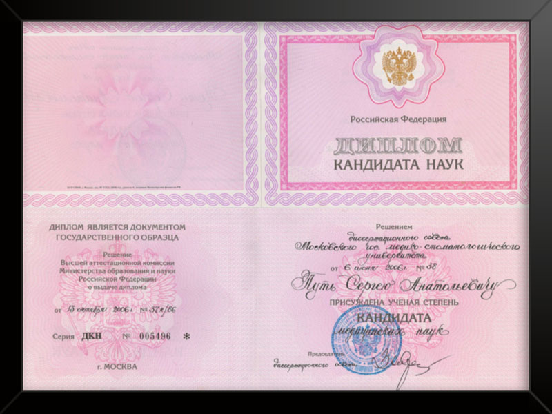 - Московский государственный стоматологический университет присуждена степень кандидата наук 2006 г. кандидатская диссертация «Применение временных внутрикостных зубных имплантатов».