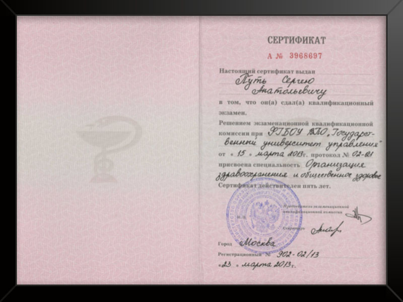 - Московская медицинская академия им. И.М. Сеченова — профессиональная переподготовка по специальности » Анестезиология и реаниматология» — 2004 г.